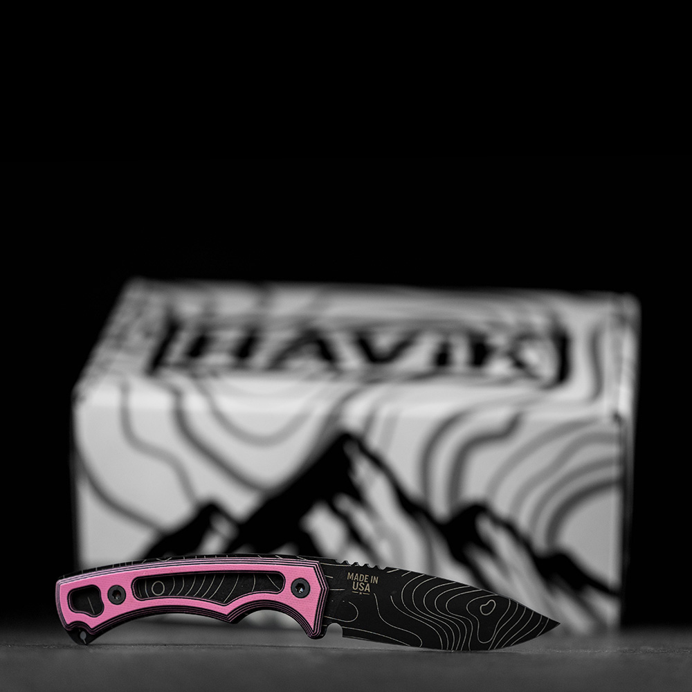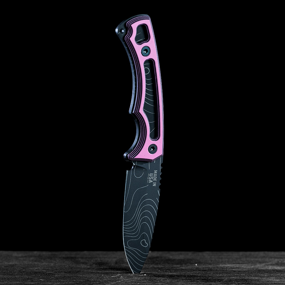 This limited edition clip point isn’t just a knife—it’s attitude in steel. With a pink handle and topographic engraving, it pairs grit with style while the parkerized finish keeps it ready for any chaos you throw its way.